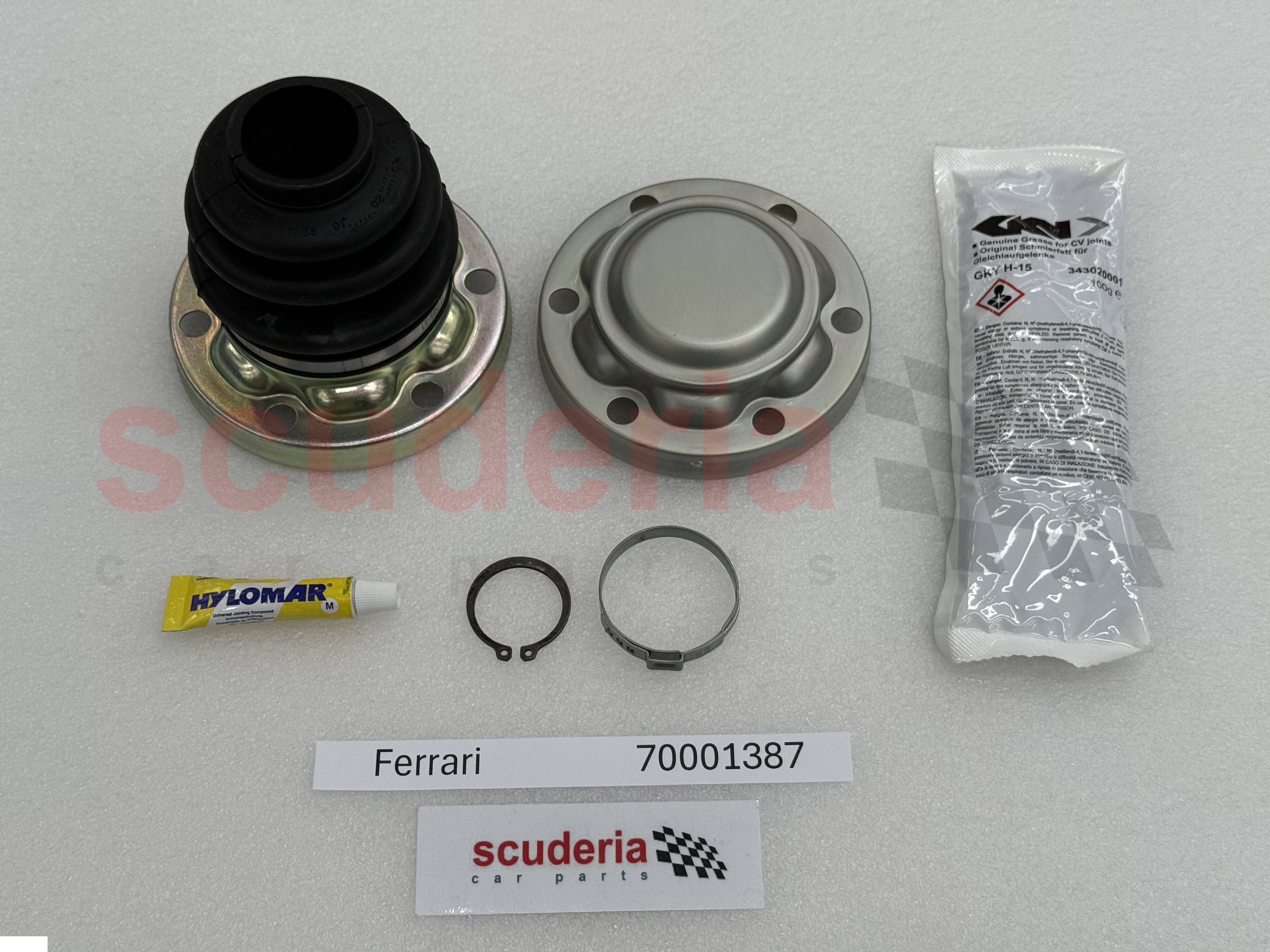Ferrari 부품 번호 70001387은 458 Italia, California, 458 Speciale, 458 Spider, 488 GTB, 488 Spider, 599 GTB Fiorano, 599 GTO 및 599 GTO를 포함한 다양한 Ferrari 모델의 드라이브 샤프트용 각반 교체 키트입니다. 599 SA Aperta.